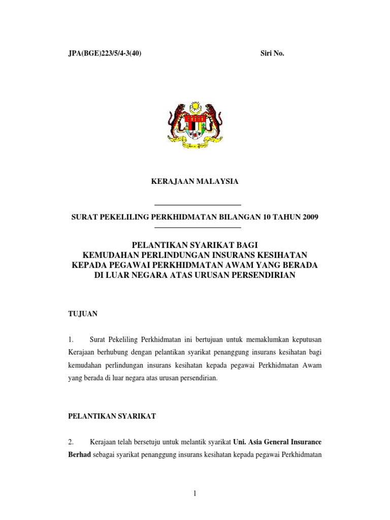 Kerajaan malaysia pekeliling perkhidmatan bilangan 8 tahun 2004 kemudahan perlindungan insurans kesihatan kepada pegawai. Kemudahan-kemudahan perkhidmatan luar negeri semua pegawai yang berkhidmat di luar negeri seperti yang ditafsirkan di bawah perkara liputan di dalam Pekeliling Perkhidmatan Bil. Pekeliling insurans ke luar negeri Thursday January 13 2022 Edit.